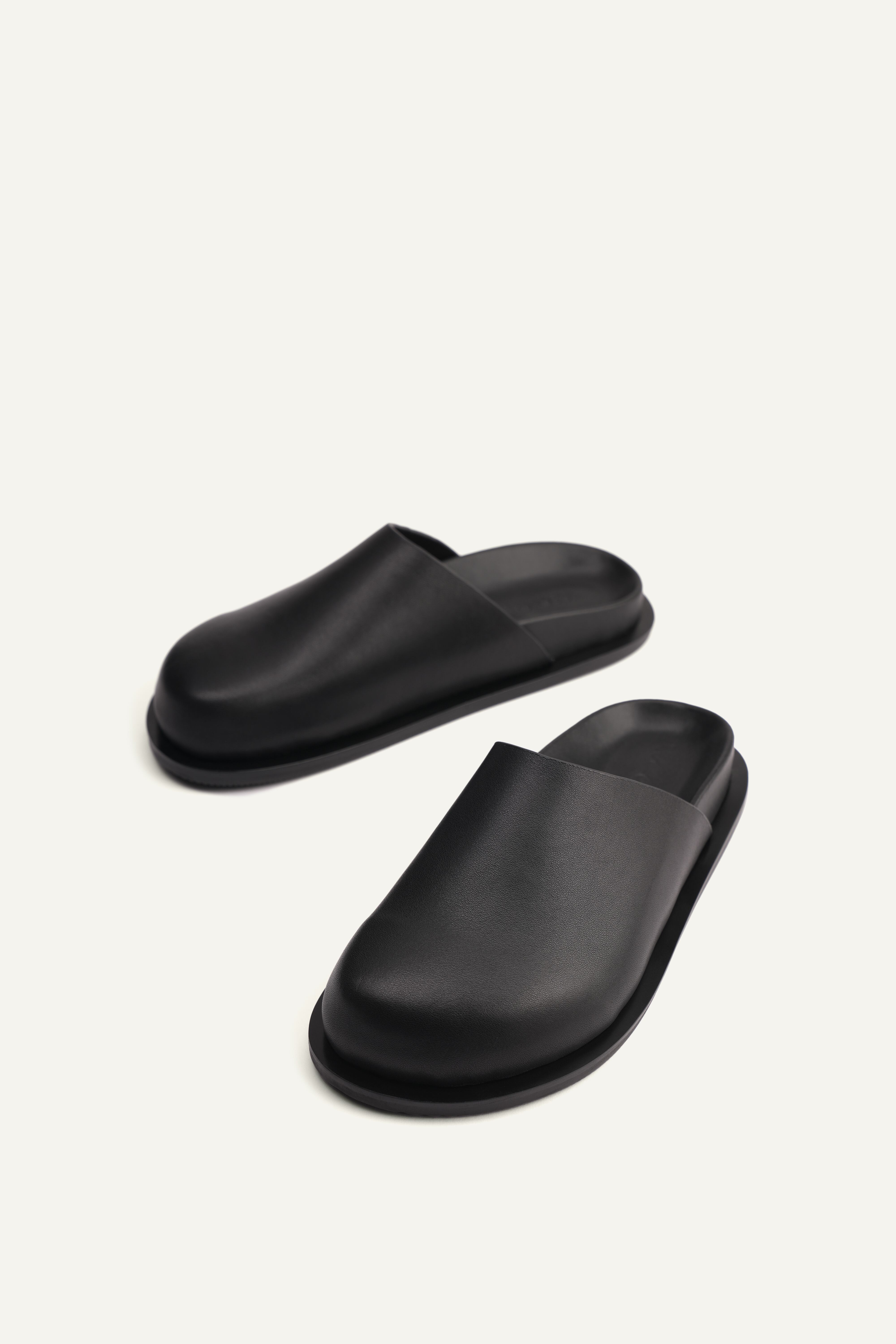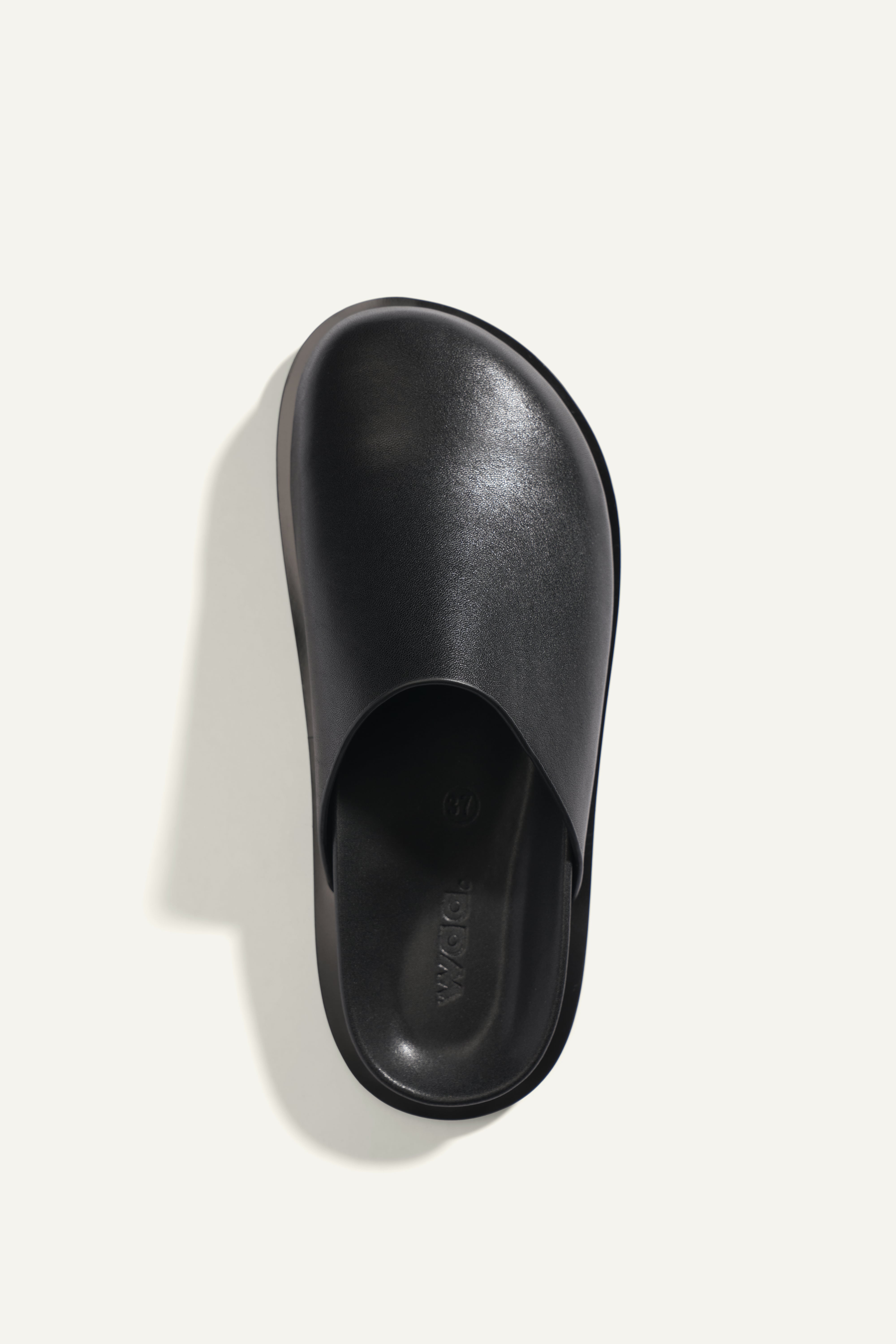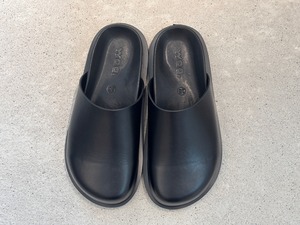 サンダル型のデザインですが、ブラックのオールレザー、ボリュームのあるラウンドデザインがモード感を漂わせ、コーディネートのポイントになります。