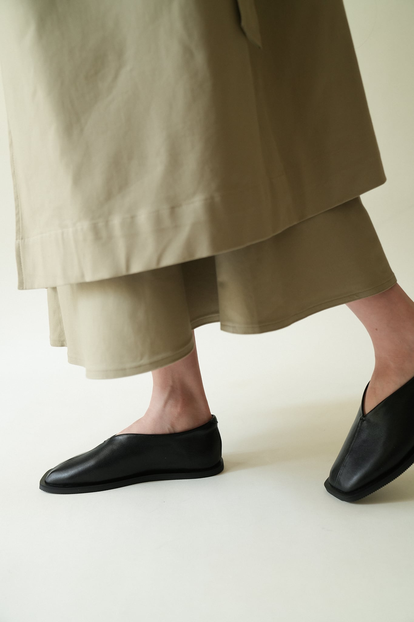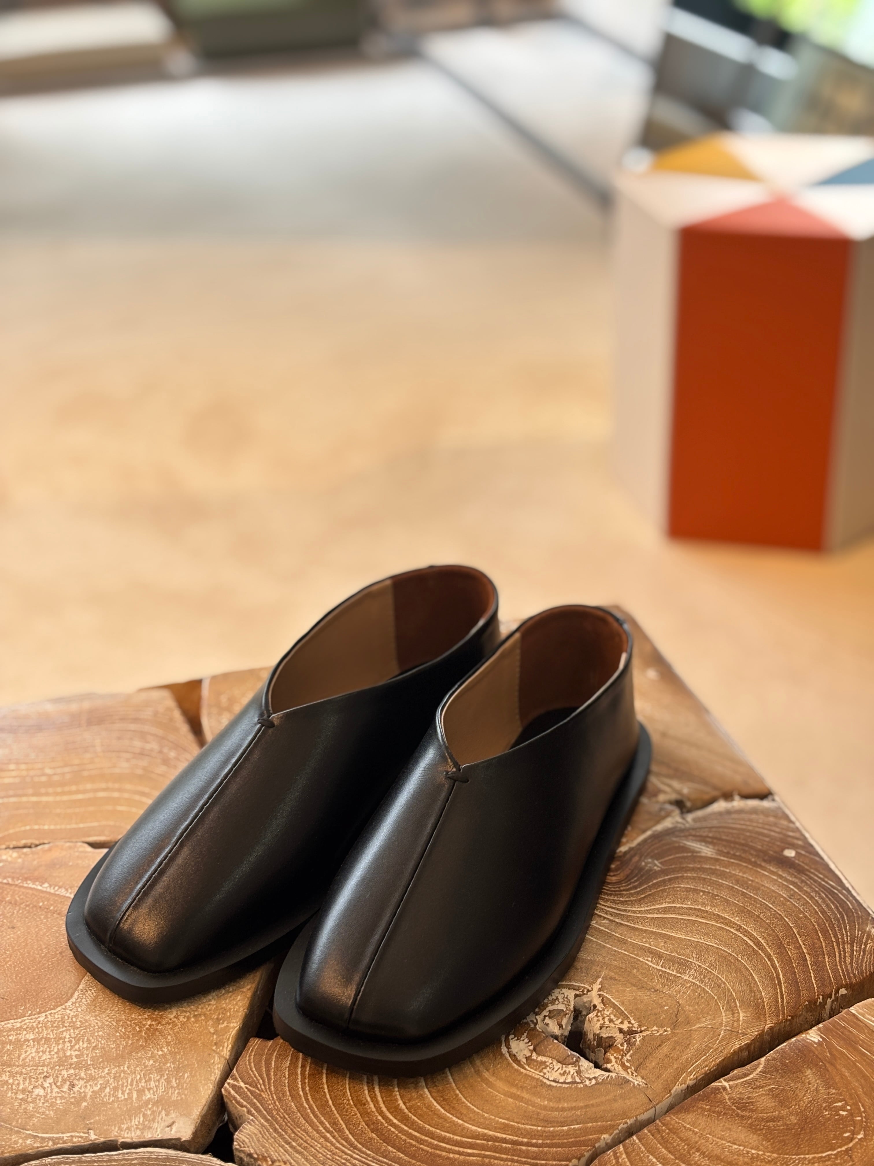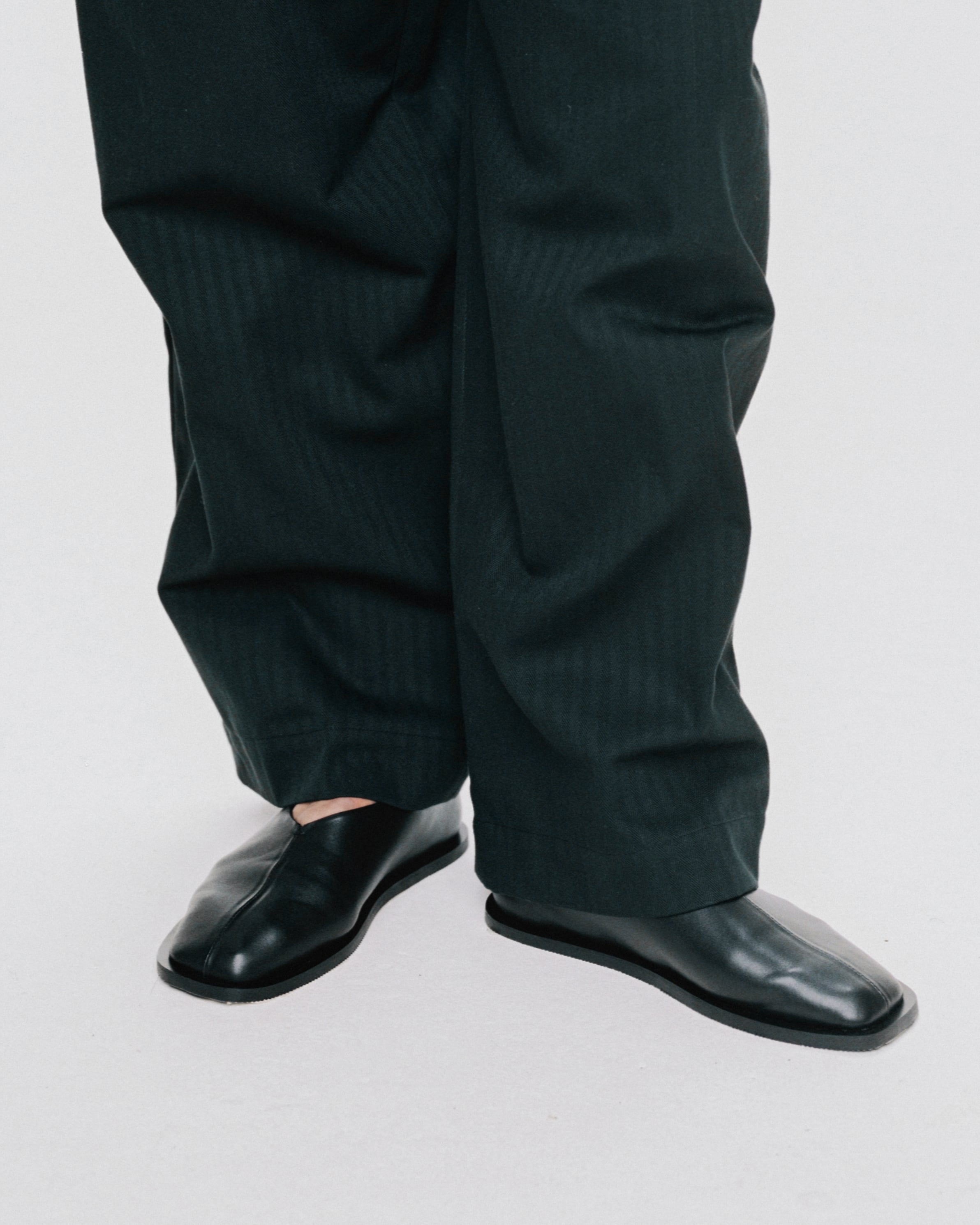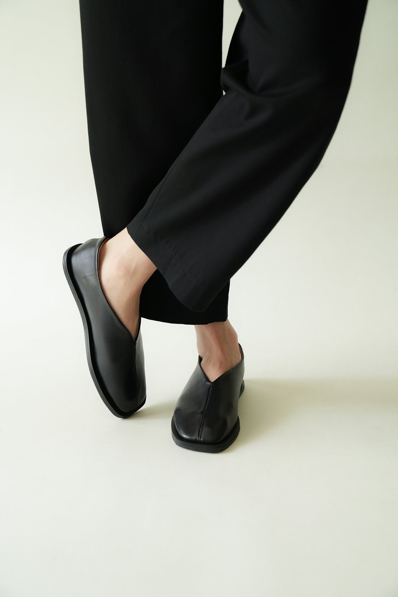 サンダル型のデザインですが、ブラックのオールレザー、ボリュームのあるラウンドデザインがモード感を漂わせ、コーディネートのポイントになります。