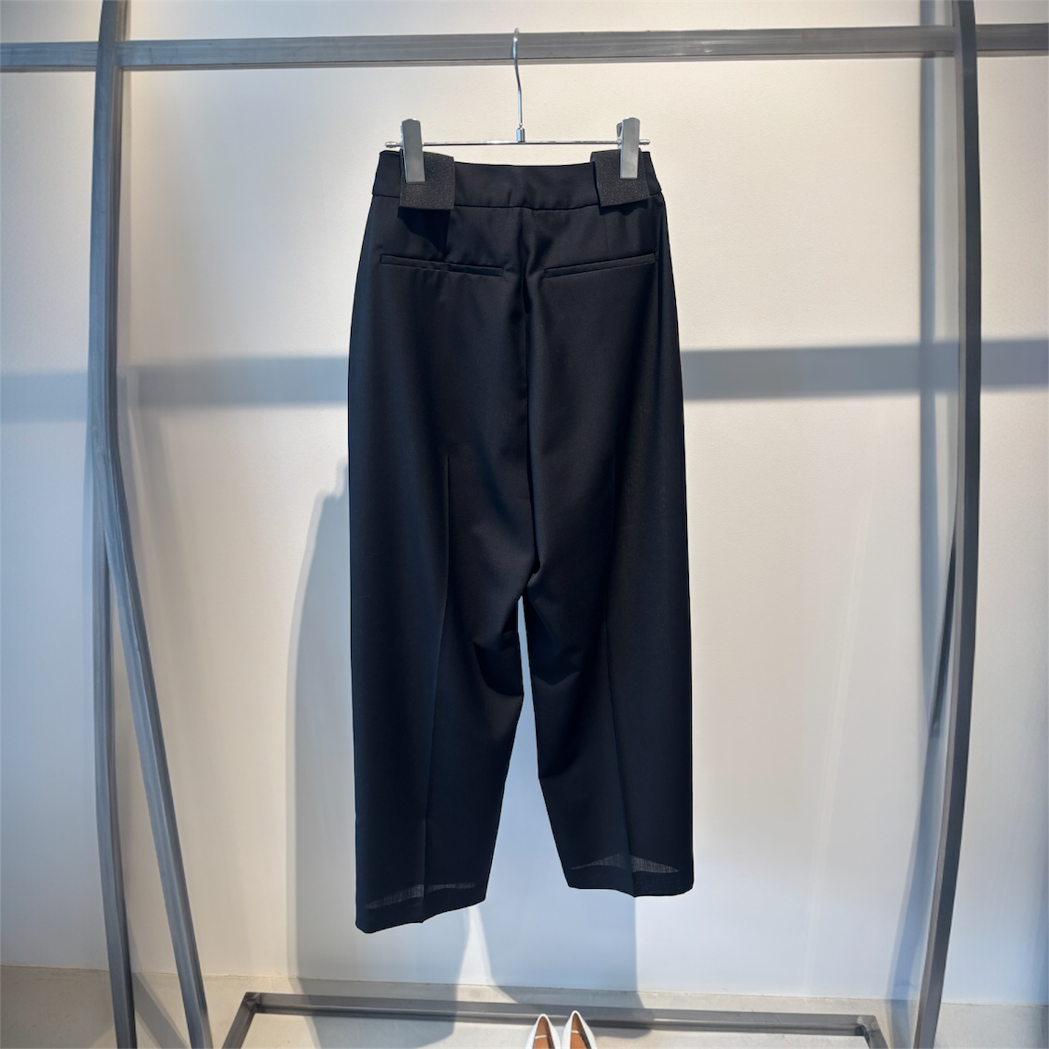 涼やかで快適な着用感が、端正な佇まいの中にリラックスしたムードを添えます。たっぷりと施したタックをポイントに、腰回りにはゆとりを持たせつつ、裾に向かって窄まるテーパードシルエットに設計。程よく構築的なフォルムが、体型や身長を問わず美しいバランスを生み出します。