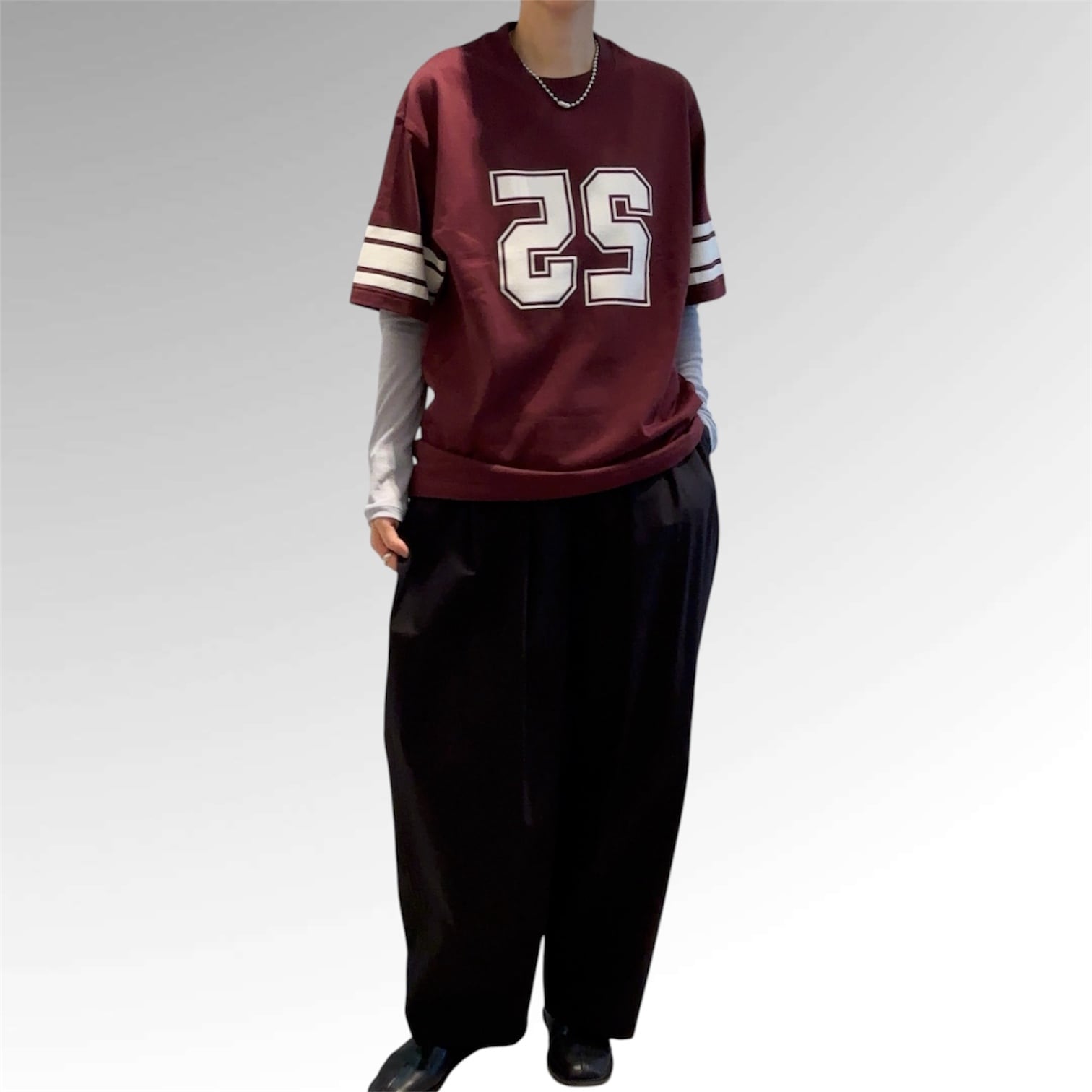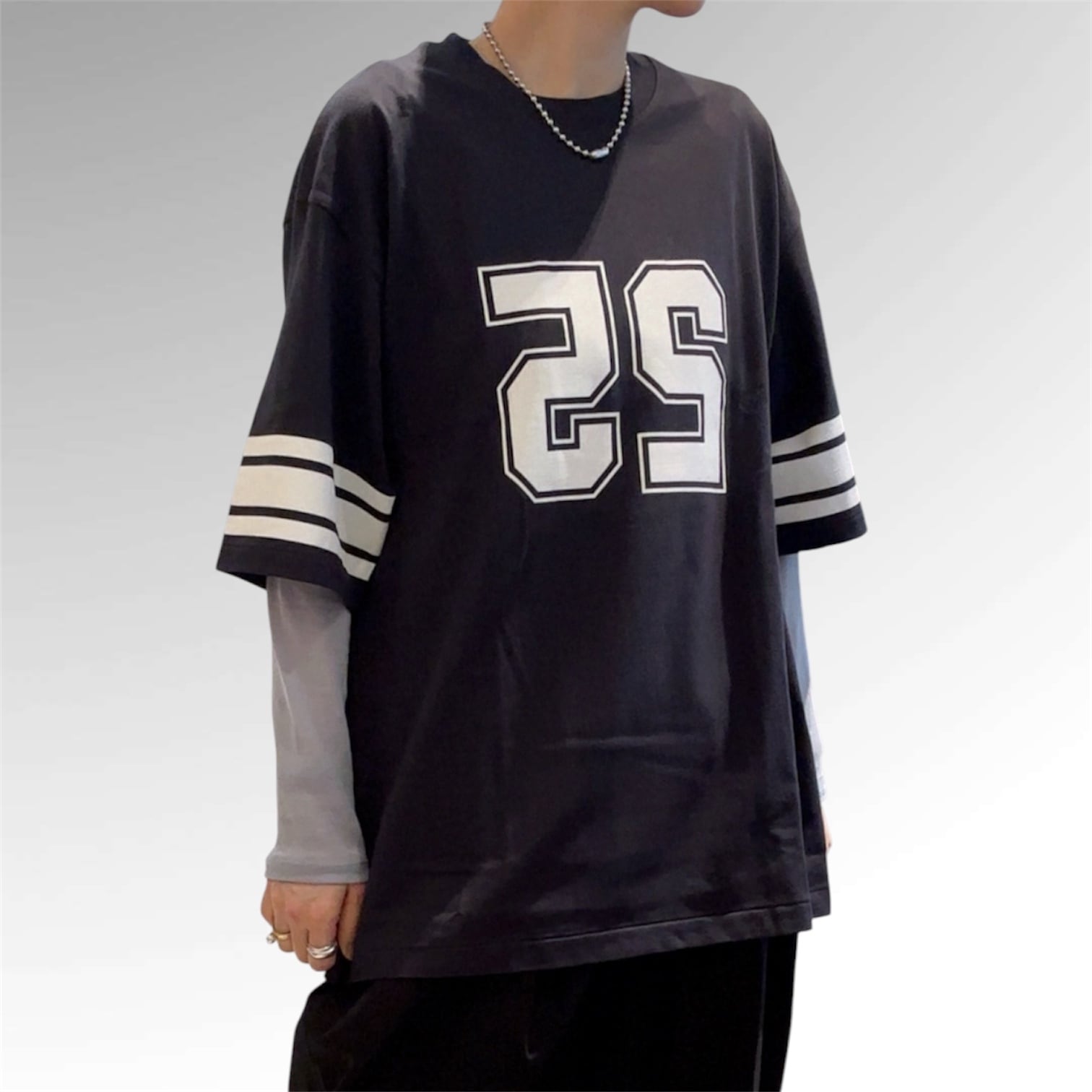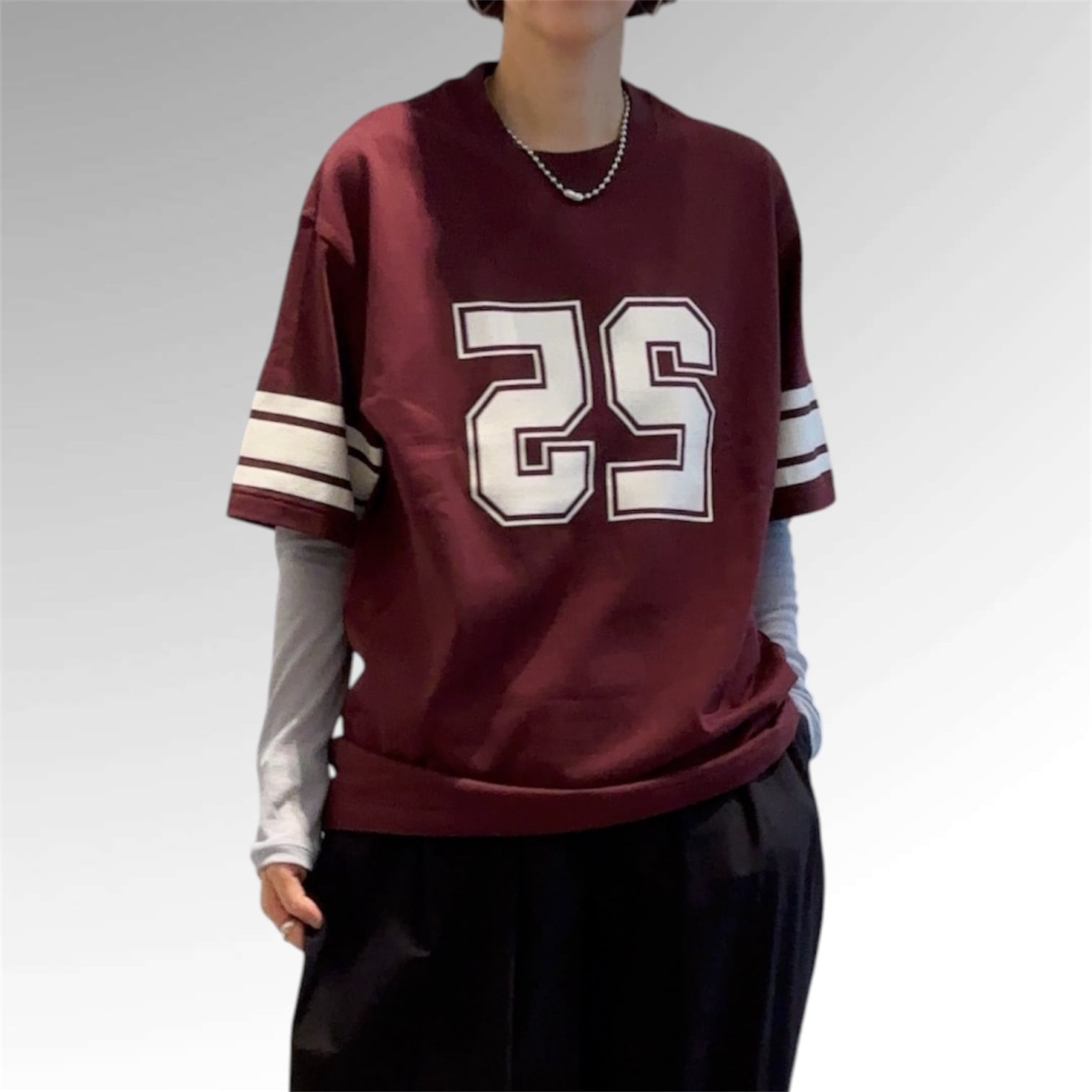 胸にナンバリングされたロゴ、袖のラインと相まって大人遊びのあるTシャツに仕上がってます。